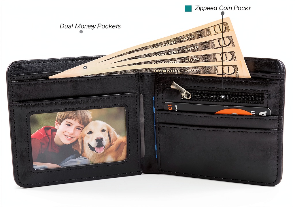 • Spacious layout with two cash pockets and a zipper coin pocket